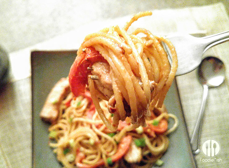 4. Drain pasta and pour sesame oil over the noodles in the strainer and toss. (This prevents the pasta from sticking together and also adds another level of flavor when you put the whole dish together).