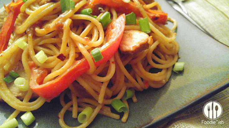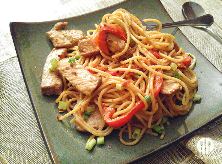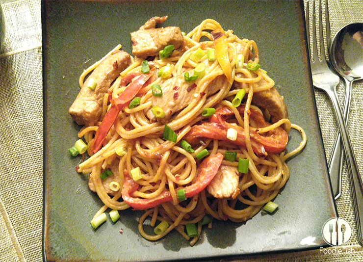 7. Pour peanut sauce into skillet and bring to a simmer. Add pork and pepper strips and pasta. Toss to coat and warm for about 1 minute. Remove from heat and divide among 4 plates. Top with chopped scallions and serve with a lime quarter. Enjoy!